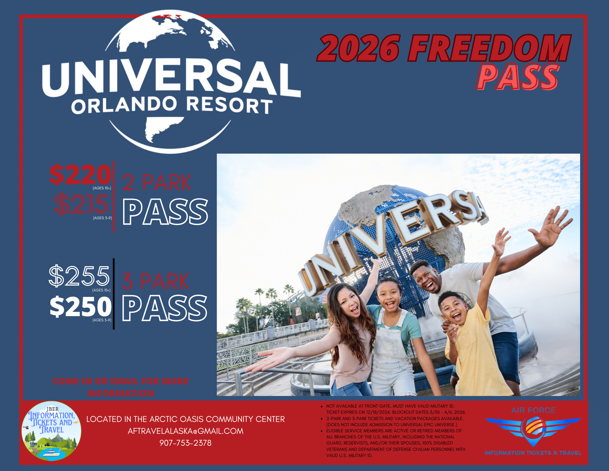 We work with all services to include Active Duty, Retirees, Reserves, Guard and DoD Civilians and Contractors. If you have access to the base, you have access to us and all that we do. However, for the “Special Military (SALUTE) tickets”, there are certain requirements. For those tickets, the only people eligible to purchase and activate are active duty and their spouse, retired and their spouse, 100% disabled and their spouse, and reservists and their spouse. For Universal tickets, the same customers are eligible as well as DoD civilians.
